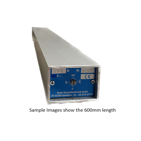 Busse Electric Heating Bars for bonding veneer and plastic edges in frame and edge presses and in workshops. Available in 230 V AC from 500 to 1450 Watt. Customs lengths are available up to 6000mm.