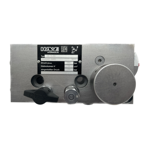 HAWE Hand Pump HD 13 AS with 350 bar, 13 Vmax, 80mm wide, 168mm tall, 80mm length. Double acting, encapsulated design, with pressure limiting and drain valve.