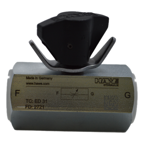 HAWE ED 31 tool adjustable (setting spindle/lock nut) single throttle valve, corner valve for direct pipe connection, can be integrated directly in the line, G 1/2 Port, 500 Bar and 60 lpm.
